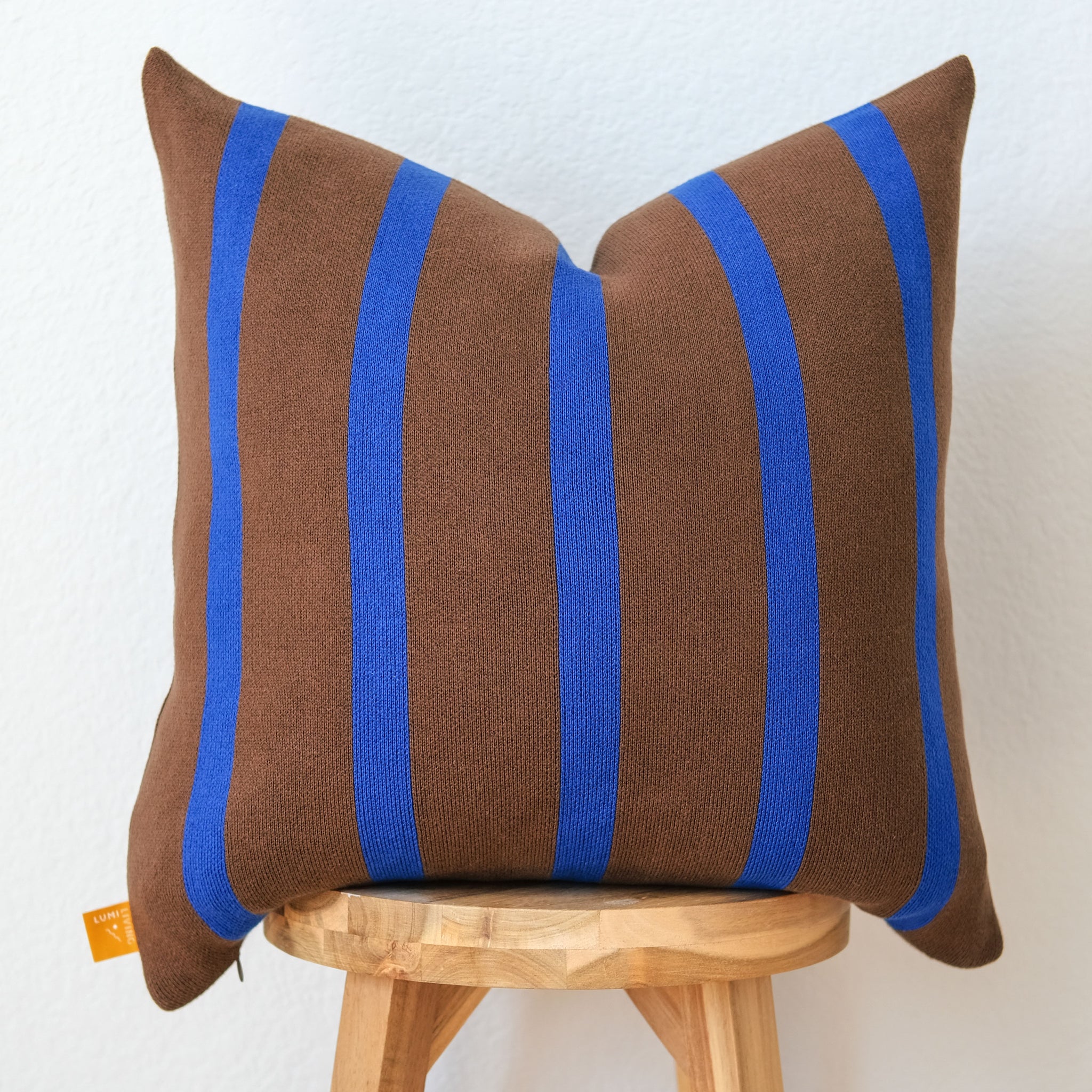Make a sophisticated statement with our Vertical Stripe Cotton Knit Pillow Cover. Featuring a high-contrast pairing of warm chocolate brown and vibrant cobalt blue, this cover brings a punch of modern energy and designer flair to any room.